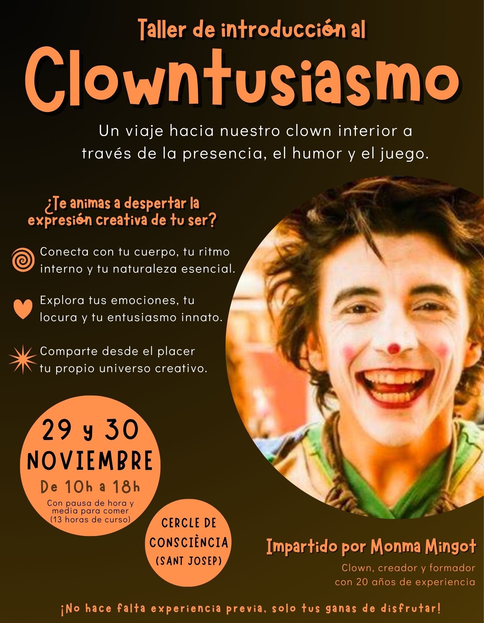 Un viaje hacia nuestro clown interior a través de herramientas de presencia corporal, ejercicios de juego escénico e investigación emocional y creativa. Siempre desde la escucha, el placer y el humor. ✨